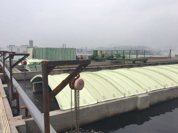3、輕質(zhì)高強(qiáng)、安裝方便:玻璃鋼集氣罩比重僅為鋼制品的1/3至1/4,固化程度高,載荷負(fù)重大,強(qiáng)度高,適用于大跨度池體,同時(shí)蓋板可分為若干小塊,便于運(yùn)輸、安裝。